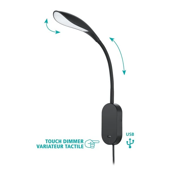 Minimaliste et fonctionnelle, l’applique murale DEL Dambera est exactement ce que vous recherchez. Cette applique murale a un fini noir mat et un col de cygne flexible qui vous permet de diriger la lumière exactement là où elle est nécessaire. Des caractéristiques telles que le port USB intégré et le gradateur tactile à trois intensités sur le corps de la lampe ajoutent à la fonctionnalité pratique de ce luminaire élégant.Fini noir matUtilise une ampoule de 5 W à DEL intégrée (non remplaçable)450 lumens, 3 000 K, blanc chaudLuminosité variable avec variateur tactile à trois intensités intégréLa tête de style col de cygne vous permet de diriger la lumière dans n’importe quelle directionAccessoires inclus pour alimenter le luminaire avec une prise électrique ou branché à la boite électrique