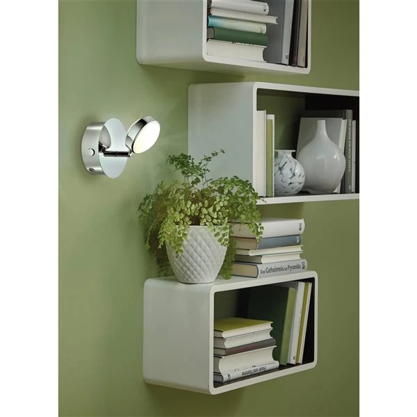 Créez du drame et de la lumière dans tout votre espace avec l’applique murale DEL Salto. L’allure unique et élégante rayonne plus de lumière en plaçant un diffuseur des deux côtés de la tête mobile. La belle finition chromée et la possibilité d’être installée au plafond ou au mur permettent à cette applique murale de se démarquer dans n’importe quelle pièce de votre maison.Fini chrome et diffuseur en acrylique satinUtilise 1 ampoule de 4,4 W à DEL intégrée (non remplaçable)490 lumens, 3 000 K, blanc chaudLuminosité variable avec gradateurs compatiblesInterrupteur à bascule situé sur la montureTête de lampe réglable