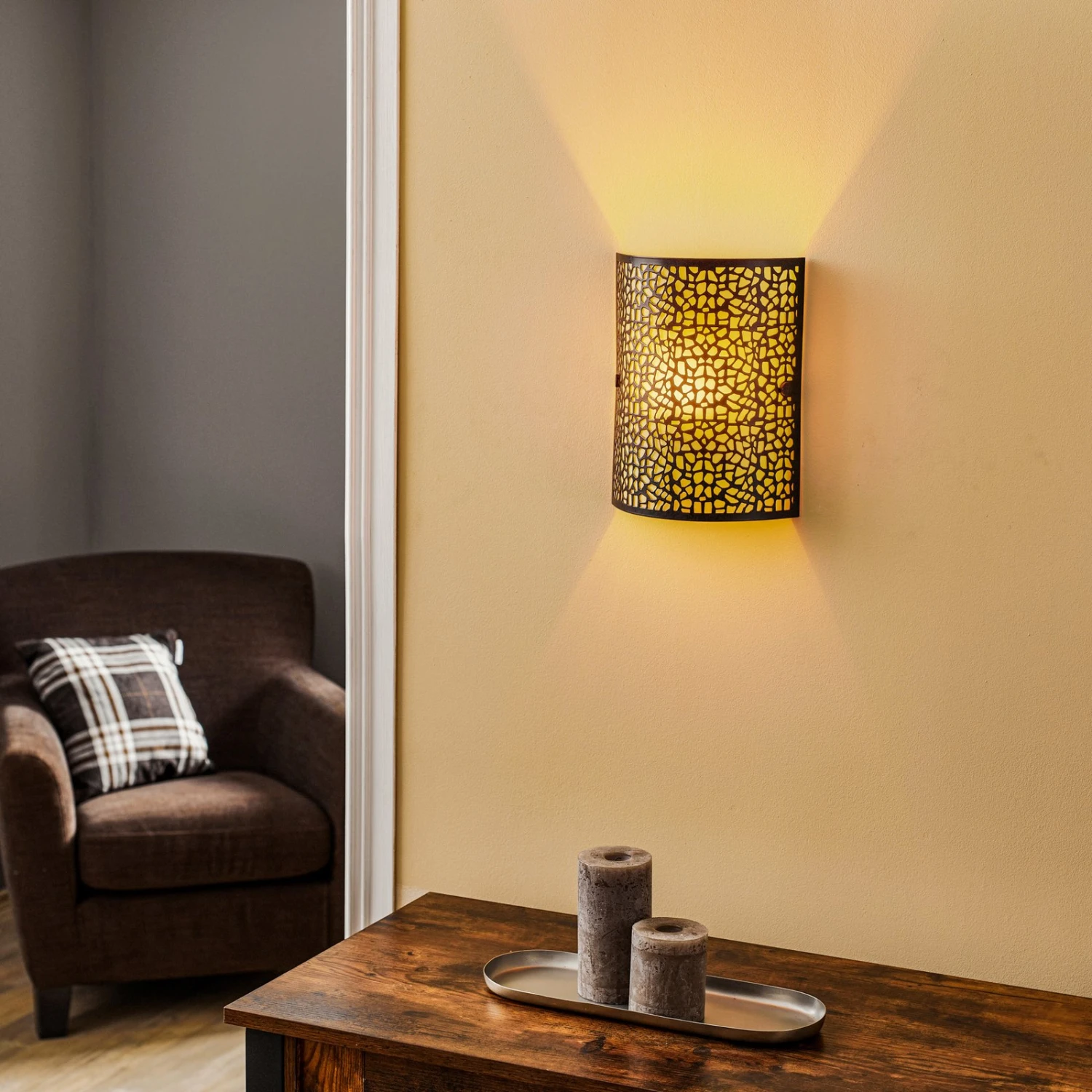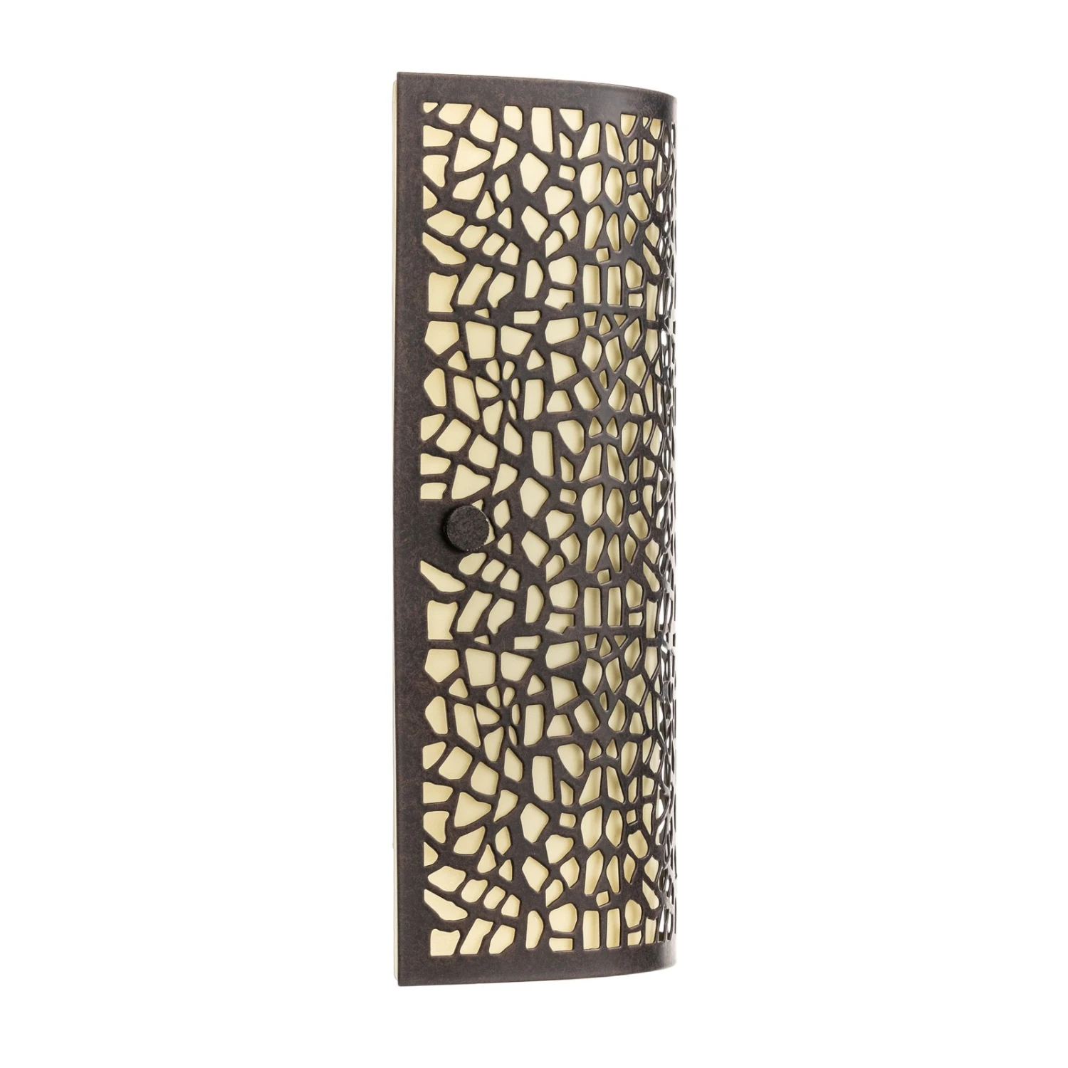 Applique ALMERA avec un superbe abat-jourL’applique ALMERA a des caractéristiques légèrement animales grâce à l’abat-jour métallique irrégulièrement ajouré qui est placé au-dessus du verre de couleur crème. La lumière est diffusée dans la pièce par les espaces intermédiaires, mais elle peut rayonner librement vers le haut et vers le bas, ce qui produit un bel effet.