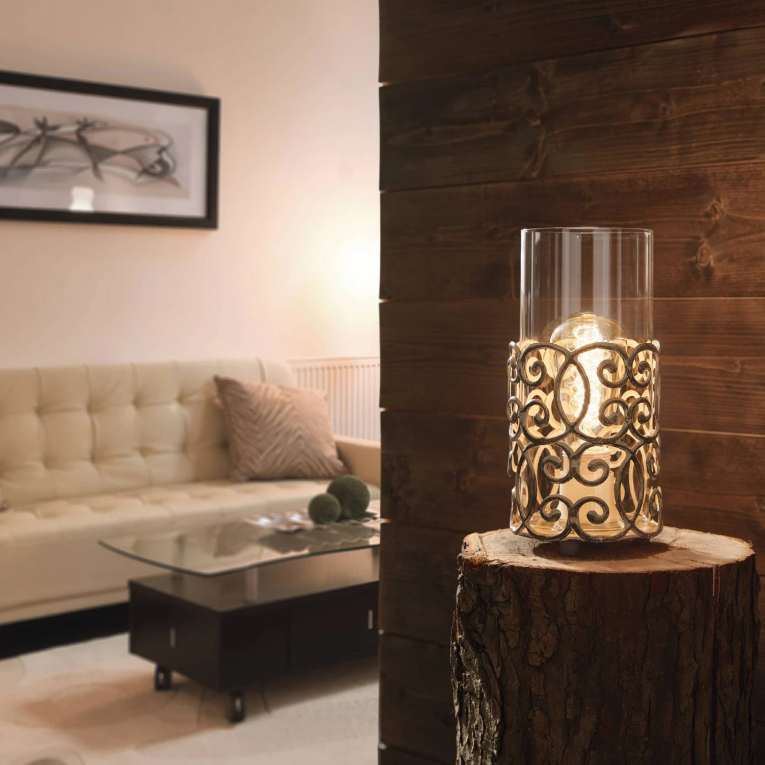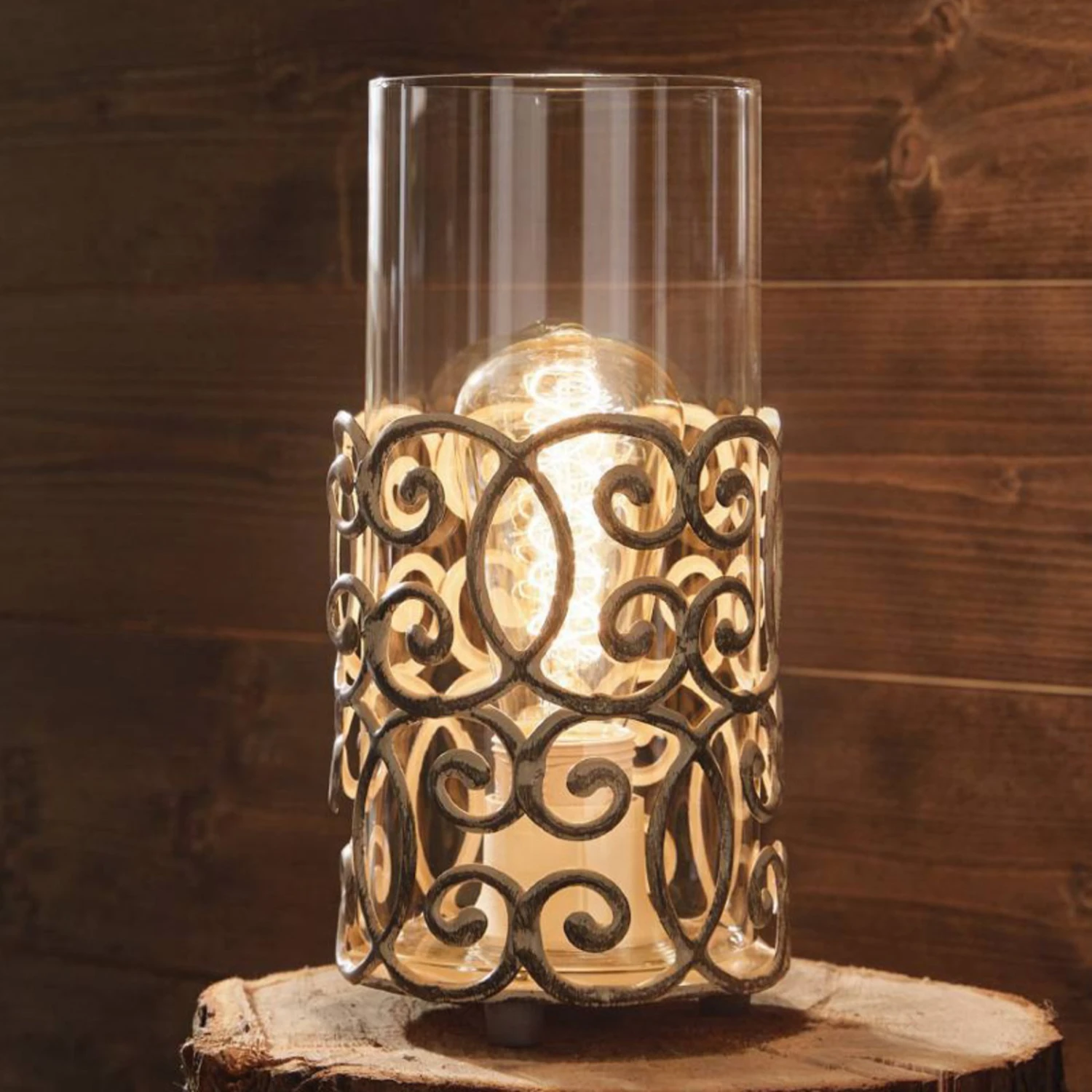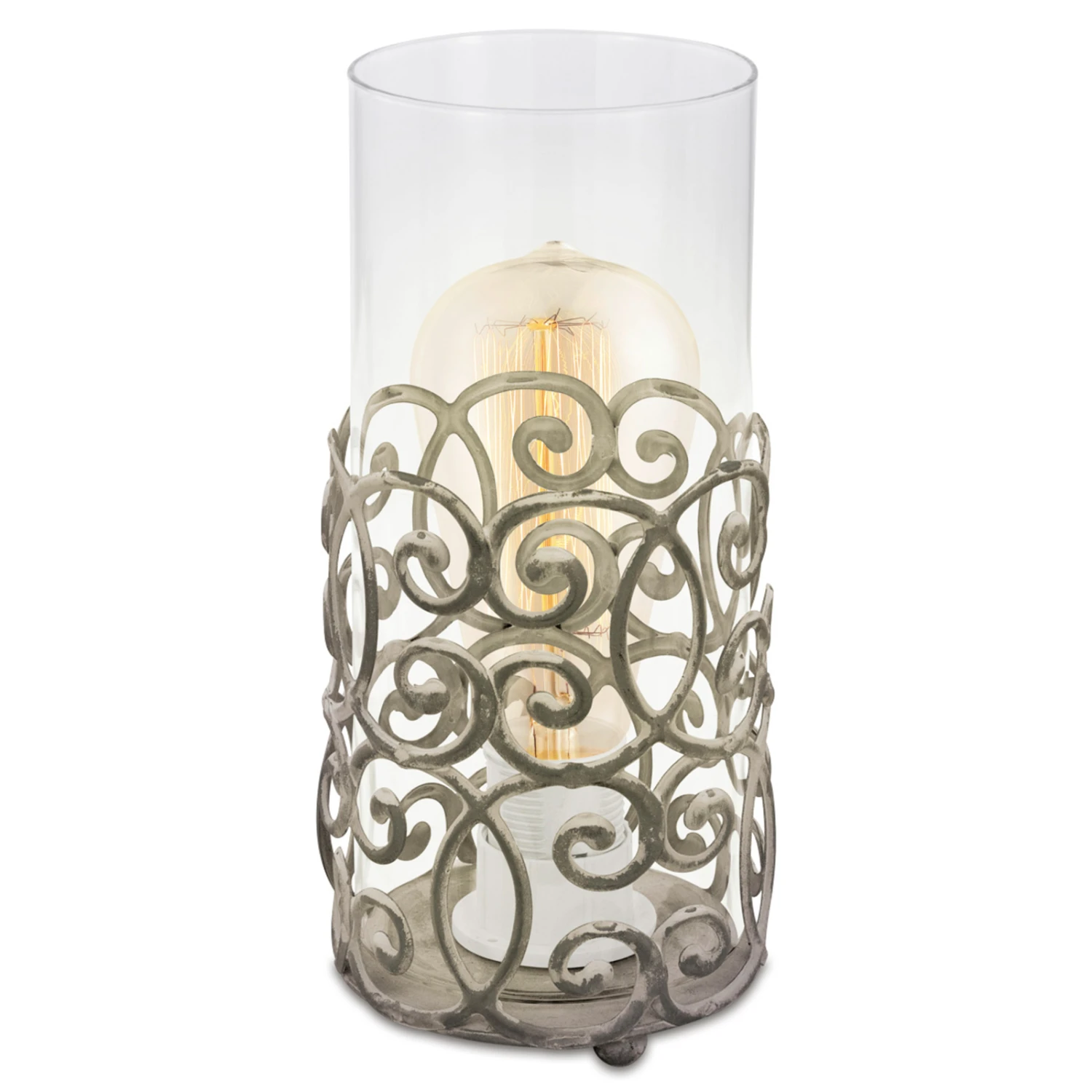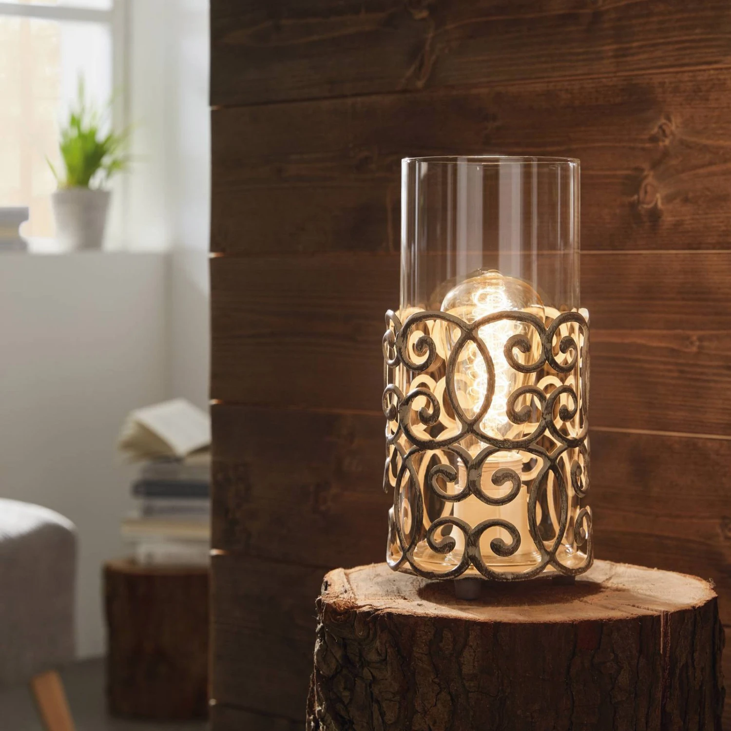 La lampe à poser Vintage ressemble à un photophore: L’armature en acier en patine brune ravit avec un motif nostalgique, le verre de lampe transparent assure une diffusion de la lumière vers tous les côtés. Qu’elle soit placée sur une table ou une commode – cette petite lampe à poser assure une ambiance lumineuse spéciale dans la pièce. Luminaire équipé d’un interrupteur sur fil.