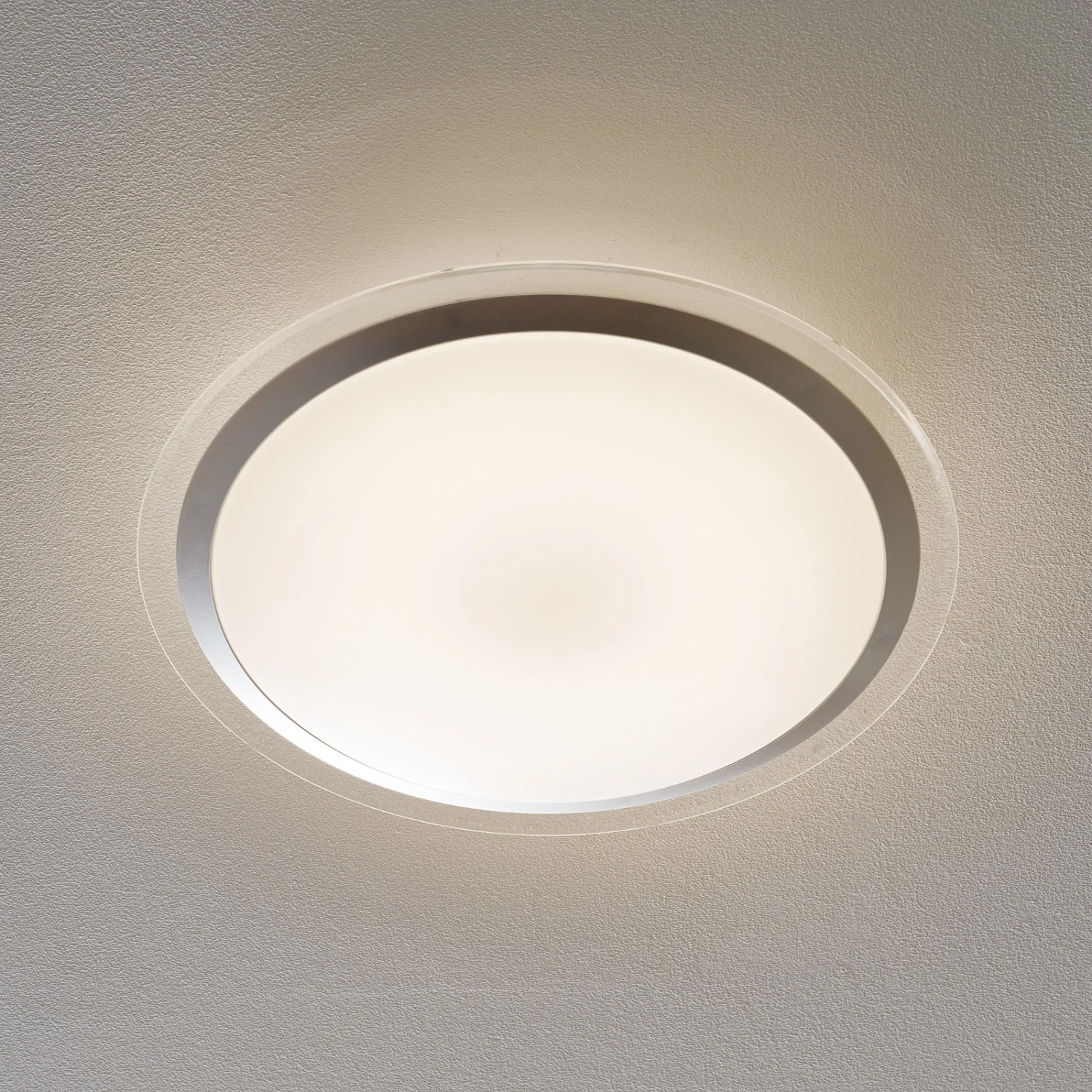 Plafonnier rond à LED Competa Connect – contrôlable via l’applicationLe plafonnier rond à LED Competa Connect offre une flexibilité absolue en matière d’éclairage. Sa forme ronde et sobre, avec un diffuseur satiné et un anneau métallique argenté décoratif, permet de l’intégrer dans presque tous les styles d’intérieur.Le plafonnier à LED peut être contrôlé via smartphone ou tablette grâce à la technologie « Connect Bluetooth ». Pour cela, il suffit de télécharger l’application gratuite disponible pour Android et IOS. L’application permet de procéder aux différents réglages de l’éclairage via le smartphone, même en déplacement. Les possibilités d’éclairage sont les suivantes:- sélection de la couleur de lumière blanche dans la plage de 2.700 à 6.500 K- sélection de l’éclairage coloré parmi plus de 16 millions de nuances de couleurs différentes- variation continue de la lumière dans toutes les couleurs de lumière sélectionnées- sélection des changements de couleur à différentes vitesses- création et enregistrement de ses propres réglages d’éclairage – appel de scènes préréglées ou enregistrées par soi-mêmeUne autre forme de commande est la télécommande disponible comme accessoire. Celle-ci permet également les réglages d’éclairage susmentionnés, sans qu’un smartphone ou une tablette ne soit nécessaire. La télécommande peut toutefois aussi être intégrée à l’application en tant que groupe, dont la définition peut être choisie librement (lampes individuelles ou pièces).