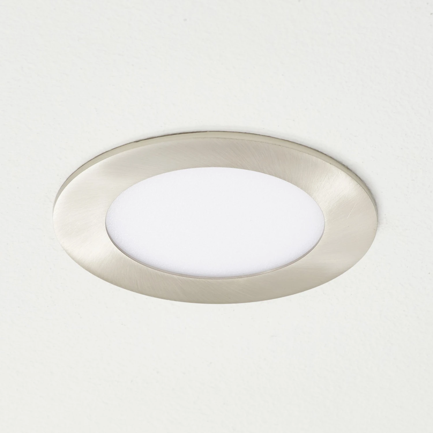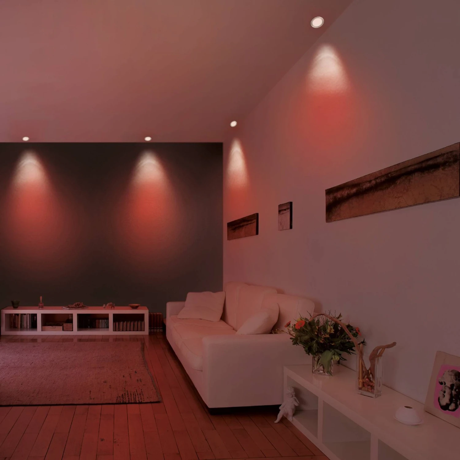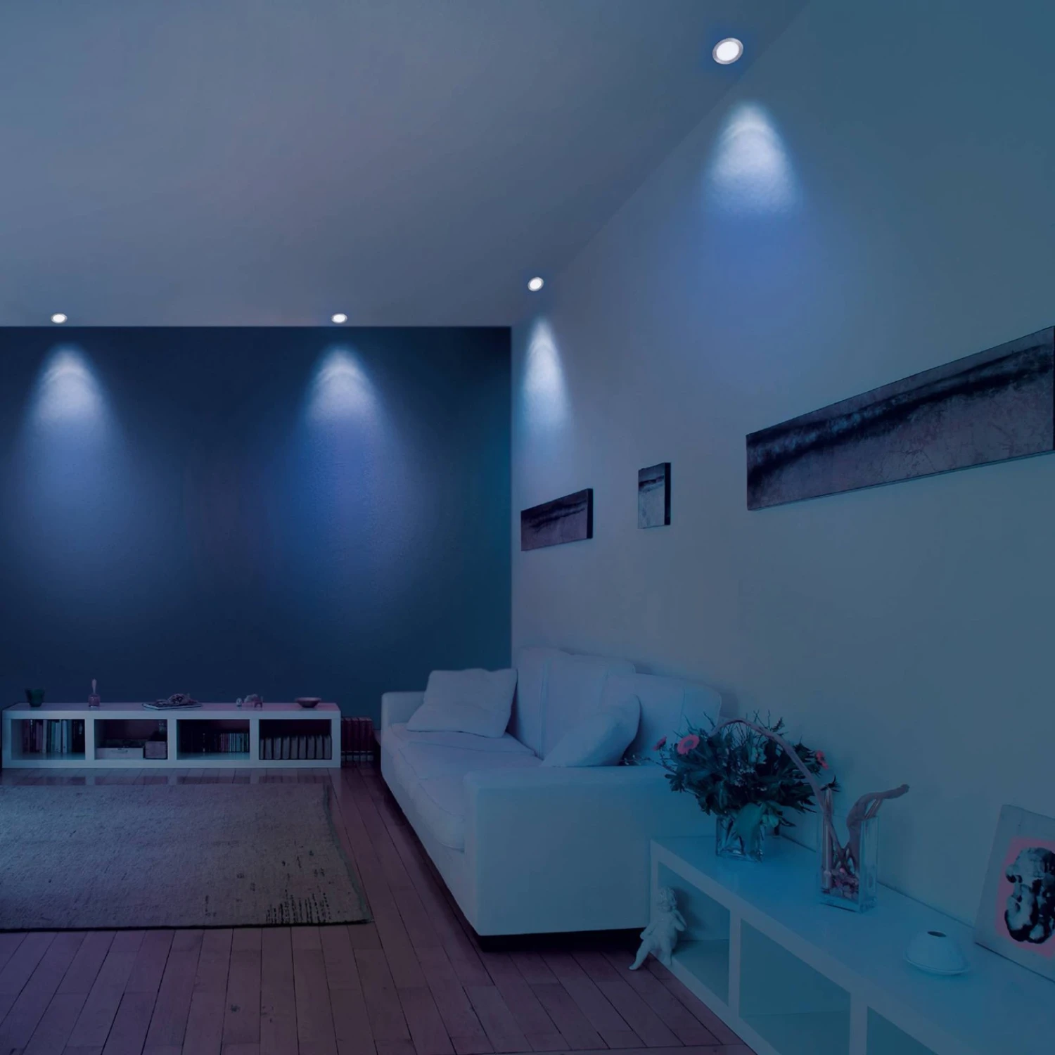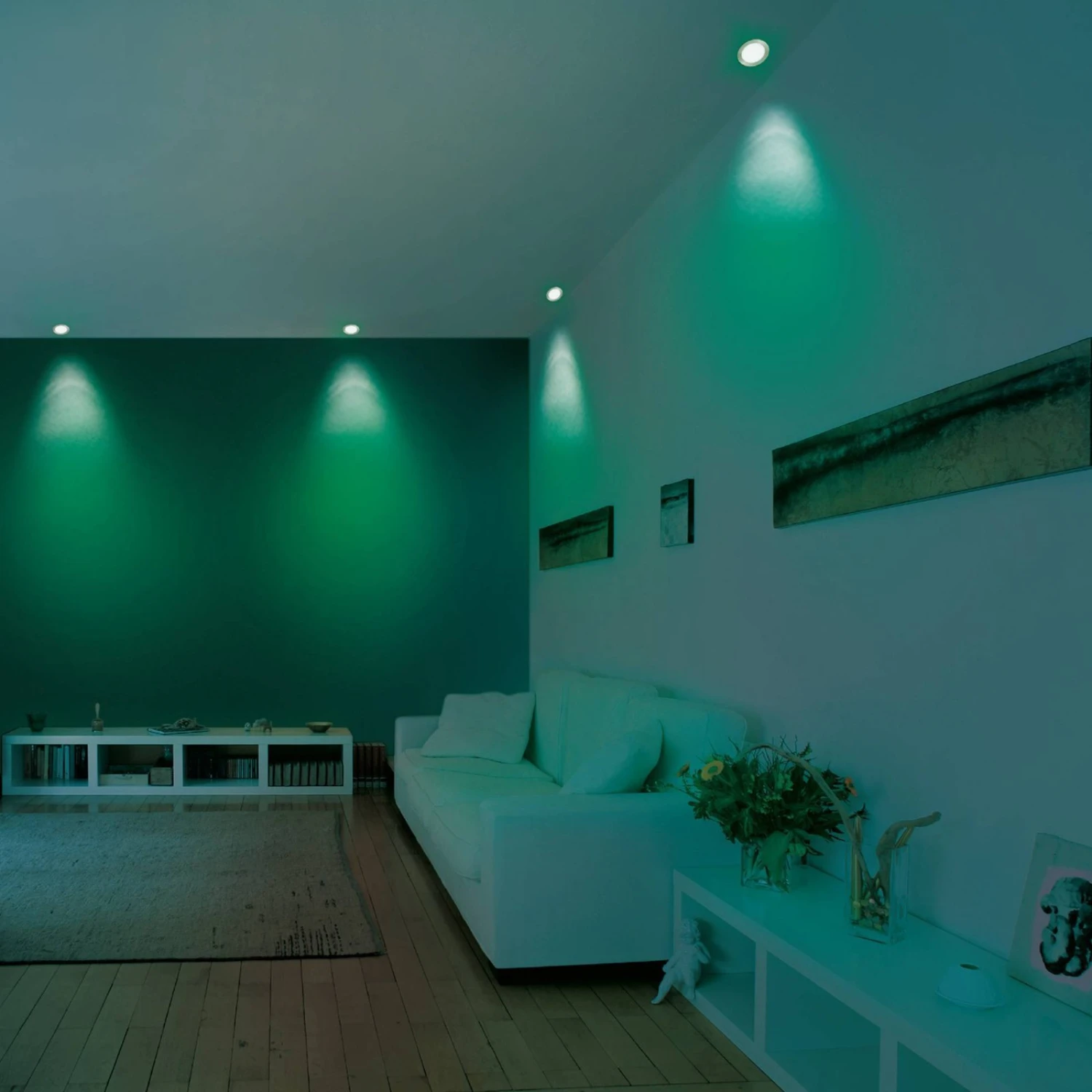 Contrôlable par app – Spot LED encastré Fueva Connect en nickel matFueva Connect est un spot LED encastré qui permet de créer un éclairage flexible dans la pièce. Il peut être commandé via une application moderne sur un smartphone ou une tablette, ou encore à l’aide d’une télécommande disponible en accessoire. Pour la commande Bluetooth via une tablette ou un smartphone, il suffit de télécharger l’application gratuite disponible pour IOS et Android. Aucun autre accessoire n’est nécessaire. Même en déplacement ou en vacances, il est ainsi possible de commander la lumière à la maison, par exemple pour simuler une présence. Les réglages sont enregistrés de manière sécurisée et cryptée dans un cloud et peuvent être consultés à tout moment.Les possibilités de conception de l’éclairage sont presque illimitées. Il est ainsi possible de choisir comme couleur de lumière l’une des 16 millions de nuances de couleur ou une lumière blanche dans une plage allant du blanc chaud (2.700 K) à la lumière du jour (6.500 K). Dans chaque couleur de lumière, l’intensité lumineuse peut être variée en continu. Il est également possible de régler des changements de couleur à différentes vitesses et d’appeler des scénarios lumineux spécialement créés ou préréglés, comme par exemple un lever de soleil pour réveiller la chambre à coucher.Le spot encastré à LED Fueva Connect s’intègre dans tous les intérieurs et peut être utilisé pour éclairer une pièce entière si plusieurs spots encastrés sont montés. Pour commander l’éclairage sans smartphone, une télécommande est disponible parmi les accessoires et permet d’effectuer pratiquement les mêmes réglages.
