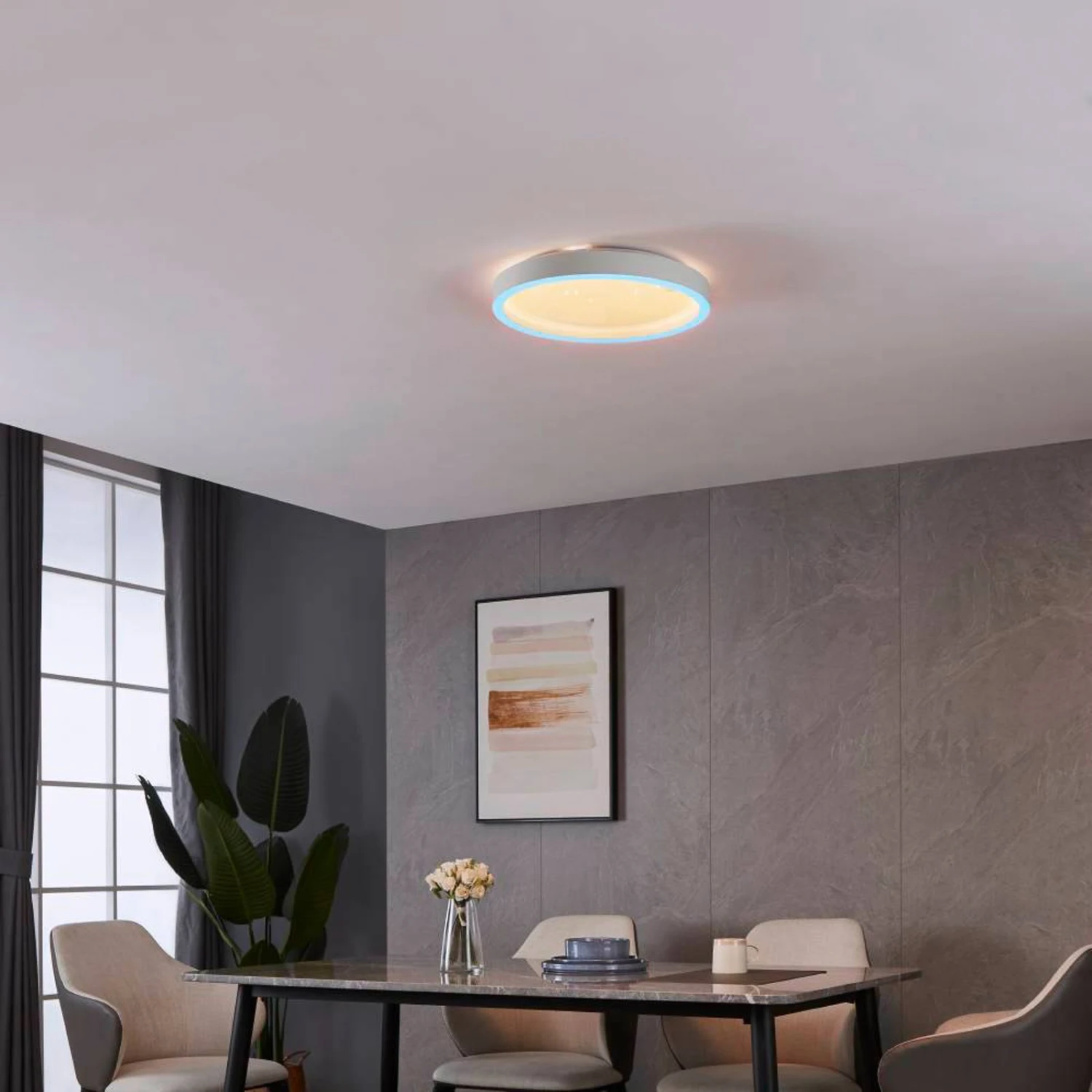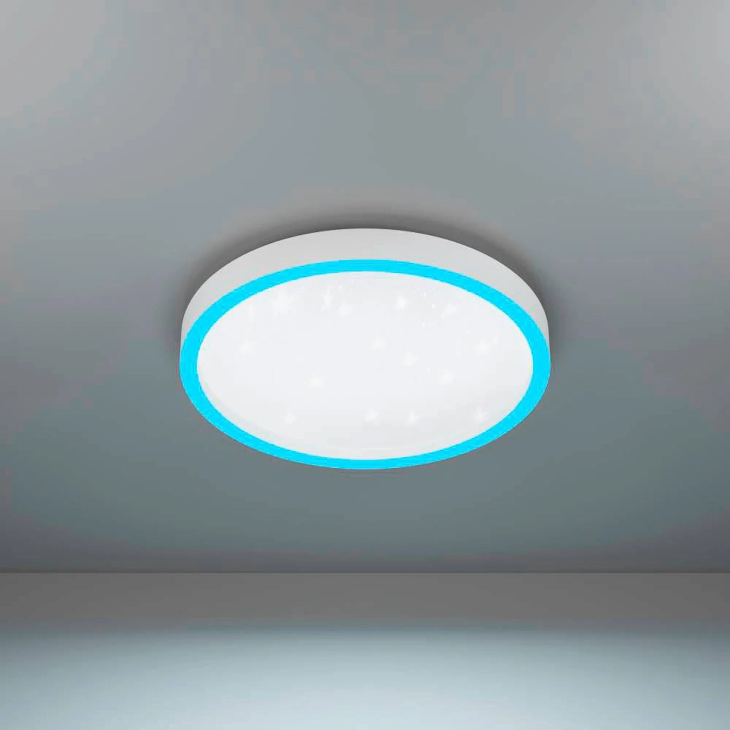 Un ciel étoilé à la maison – Plafonnier LED Montemorelos-Z avec fonction RGBWLe plafonnier LED Montemorelos-Z séduit par sa sobriété et son élégance. Son cadre rond comprend un diffuseur en plastique blanc à effet cristal, ce qui lui donne l’apparence d’un ciel étoilé scintillant. Grâce à la technologie ZigBee 3.0 intégrée, ce plafonnier peut être commandé via une application, ce qui offre de nombreuses possibilités de réglage. Outre la simple variation de l’intensité lumineuse, il est possible de choisir parmi de nombreuses couleurs et nuances de blanc, ce qui permet de créer à tout moment la lumière adéquate. Encore plus d’individualité est réalisée par la formation de groupes, la création d’horaires ou la simulation de présence qui y est liée.Fonctions / Compatibilité:- contrôlable avec l’application gratuite AwoX HomeControl- compatible avec les systèmes smart home d’autres fabricants qui utilisent ZigBee 3.0- connexion directe avec Amazon Echo et Google Home possible- portée accrue grâce à un maillage Bluetooth supplémentaire- jusqu’à 50 luminaires ou ampoules contrôlables simultanément- compatible avec tous les articles de la série EGLO connect-c Bluetooth- contrôlable avec une télécommande adaptée même sans accès à Internet (voir accessoires)