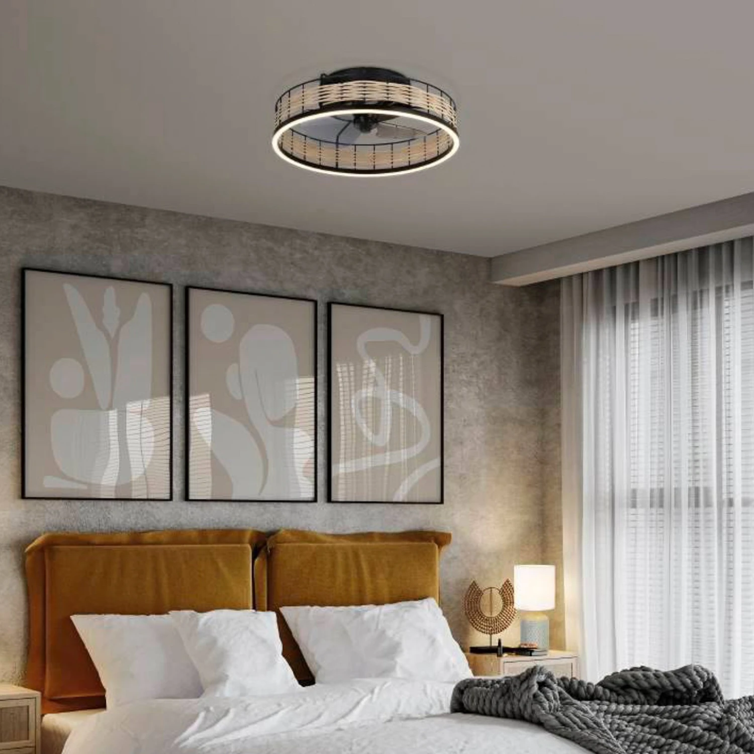 Décoré de rotin – le ventilateur de plafond à LED Frana, à intensité variableCe ventilateur de plafond ne convainc pas seulement par sa fonctionnalité mais aussi par son design attrayant. Dans le cas de Frana, le ventilateur est entouré d’un abat-jour moderne en rotin tressé, sur le bord duquel est intégrée la barre lumineuse avec les LED. La couleur et l’intensité de la lumière peuvent être réglées de manière flexible. Le ventilateur est également contrôlable par télécommande et dispose de trois vitesses.- moteur AC 35 W- 2434 m³/h- fonction tunable white- télécommande piles non comprises
