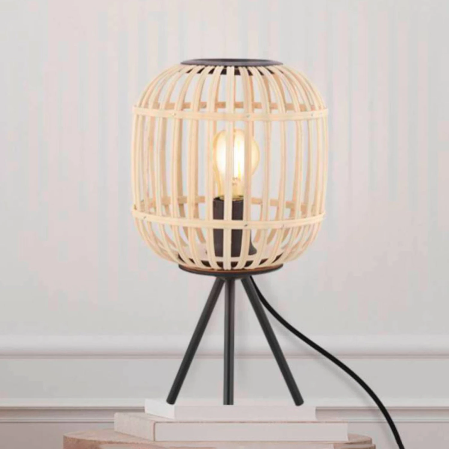 L’abat-jour en forme de tonneau est clairement structuré et est formé de lamelles de bois claires. Il est soutenu par trois pieds en acier noir et présente des détails noirs en haut et en bas. La lampe de table s’intègre simplement et élégamment dans la pièce. Grâce à la neutralité de ses couleurs et à la clarté de ses formes, il est intemporel et s’intègre dans de nombreux styles.