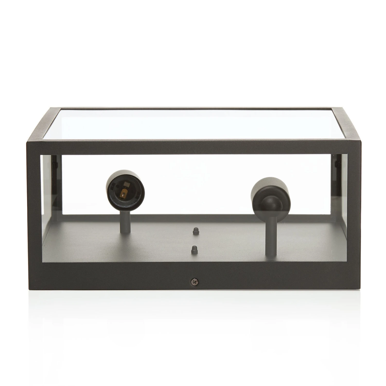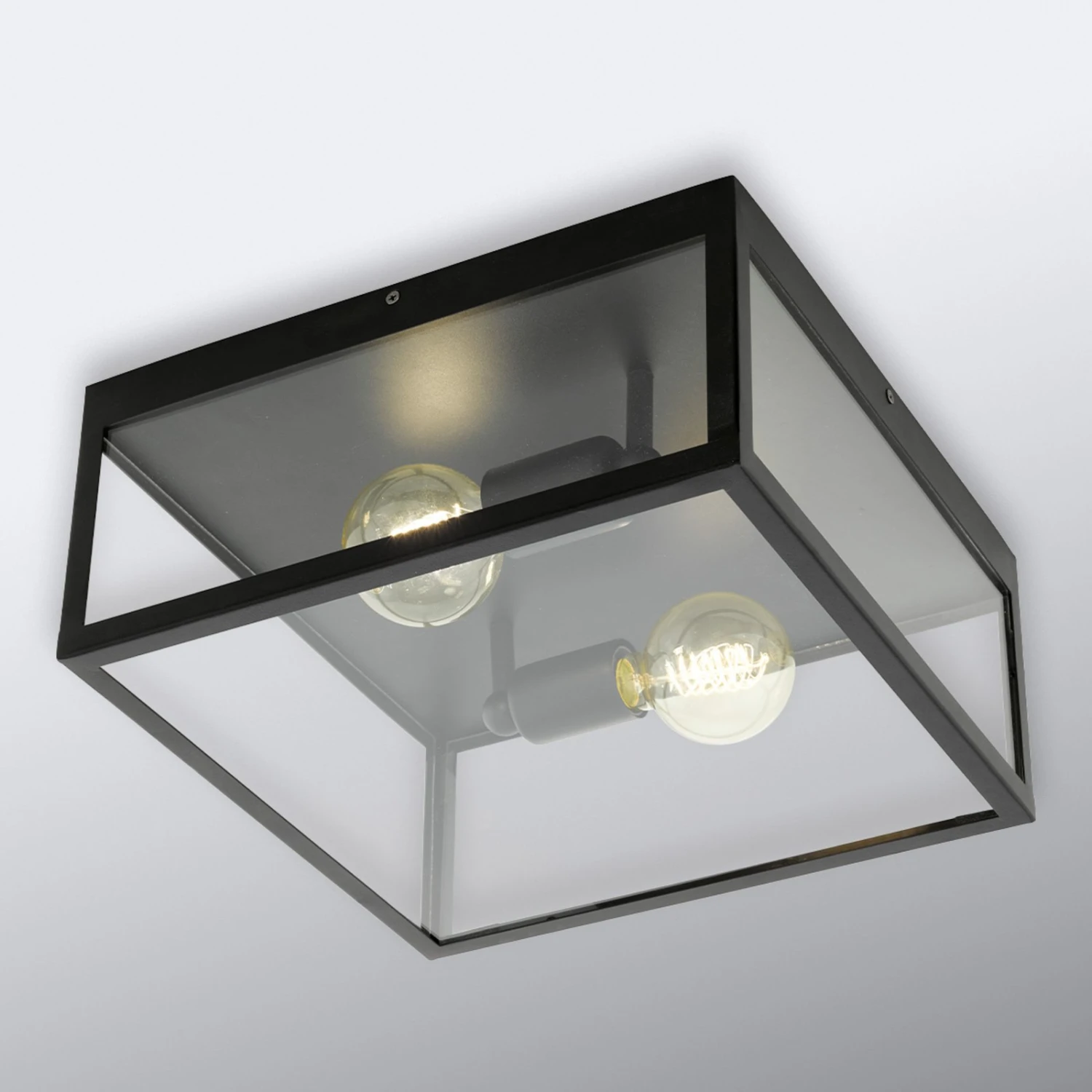 Le plafonnier Charterhouse est composé d’une plaque de plafond noire et d’un cadre en métal laqué noir dans lequel des vitres en verre transparent ont été installées. Les deux ampoules sont non seulement visibles au travers du verre transparent, mais peuvent également diffuser la lumière sans obstacles dans l’environnement. Un effet spécialement magnifique est attribué au plafonnier Charterhouse si des ampoules à incandescence ou des ampoules globe en version LED avec un bel effet de filament de carbone sont installées dans les culots E27. Celles-ci offrent non seulement un éclairage chaleureux, mais économise de surcroît beaucoup d’énergie.