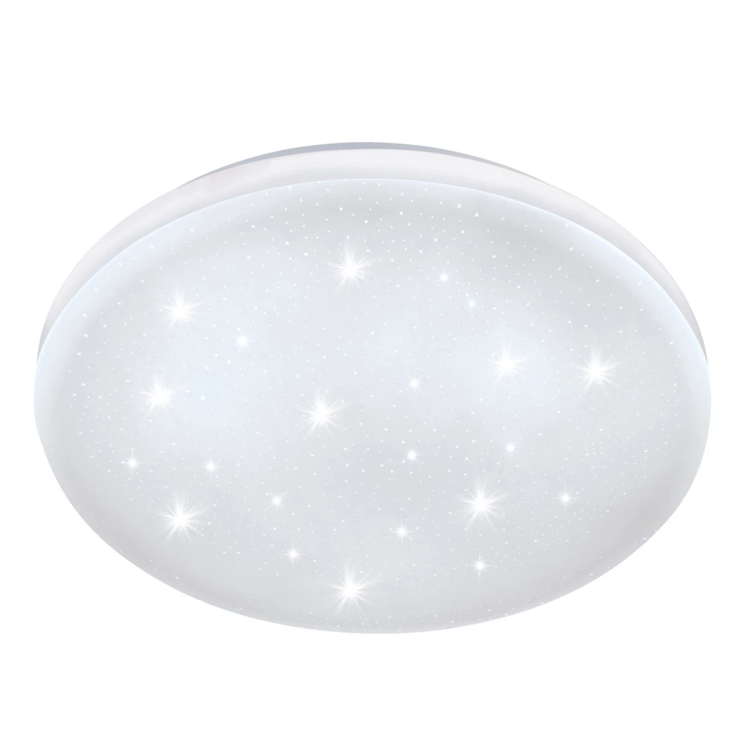 Le plafonnier LED Frania-S représente une source lumineuse d’éclairage général presque universelle dans chaque pièce et chaque ambiance. L’élément de plafond de la lampe est en acier, l’abat-jour est en matériau synthétique. L’abat-jour est travaillé avec un effet cristal, à peine visible quand la lumière éteinte. Toutefois, dès que la lampe est allumée, un ciel étoilé scintillant apparaît sur l’abat-jour, sur lequel des étoiles petites et grandes brillent comme des cristaux.