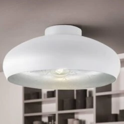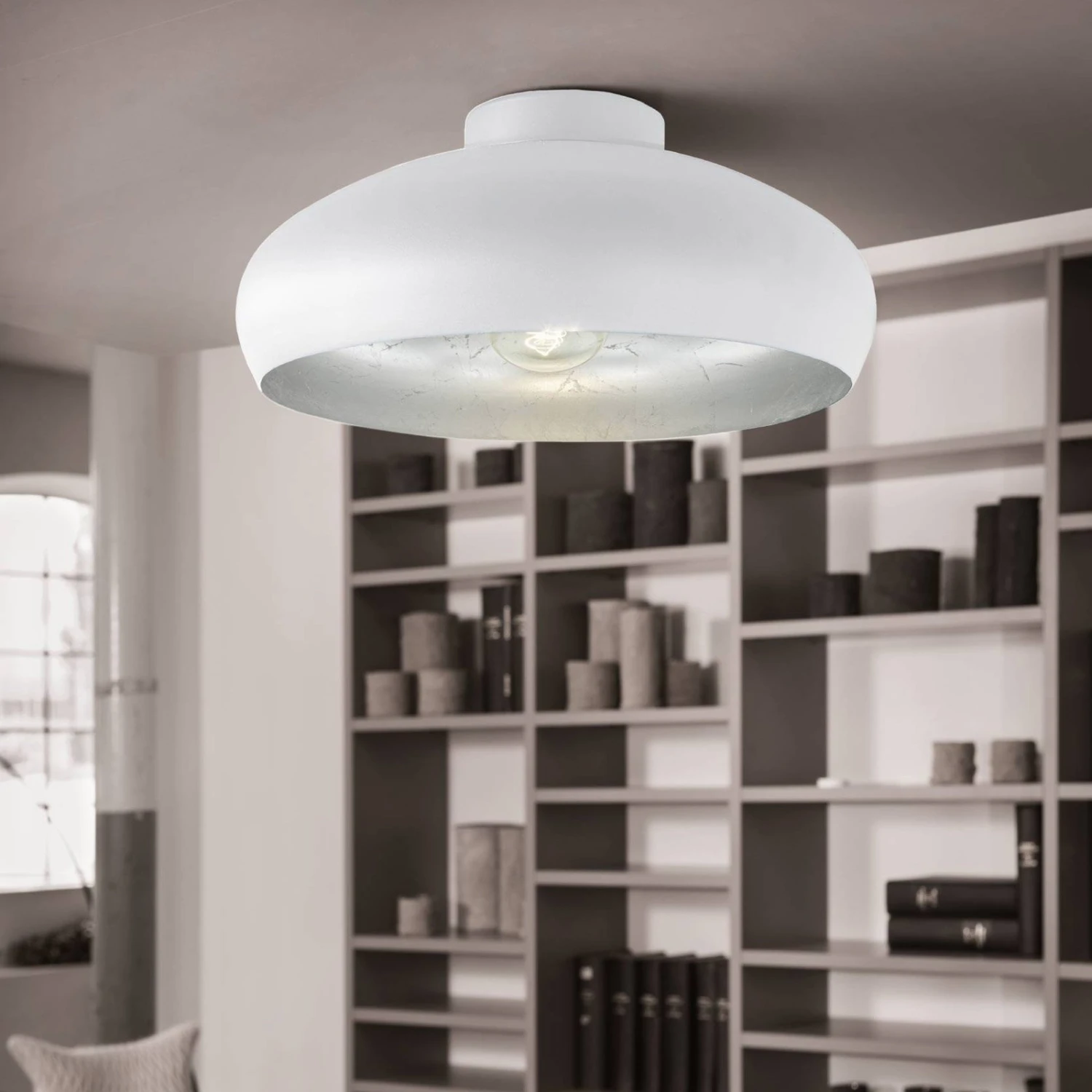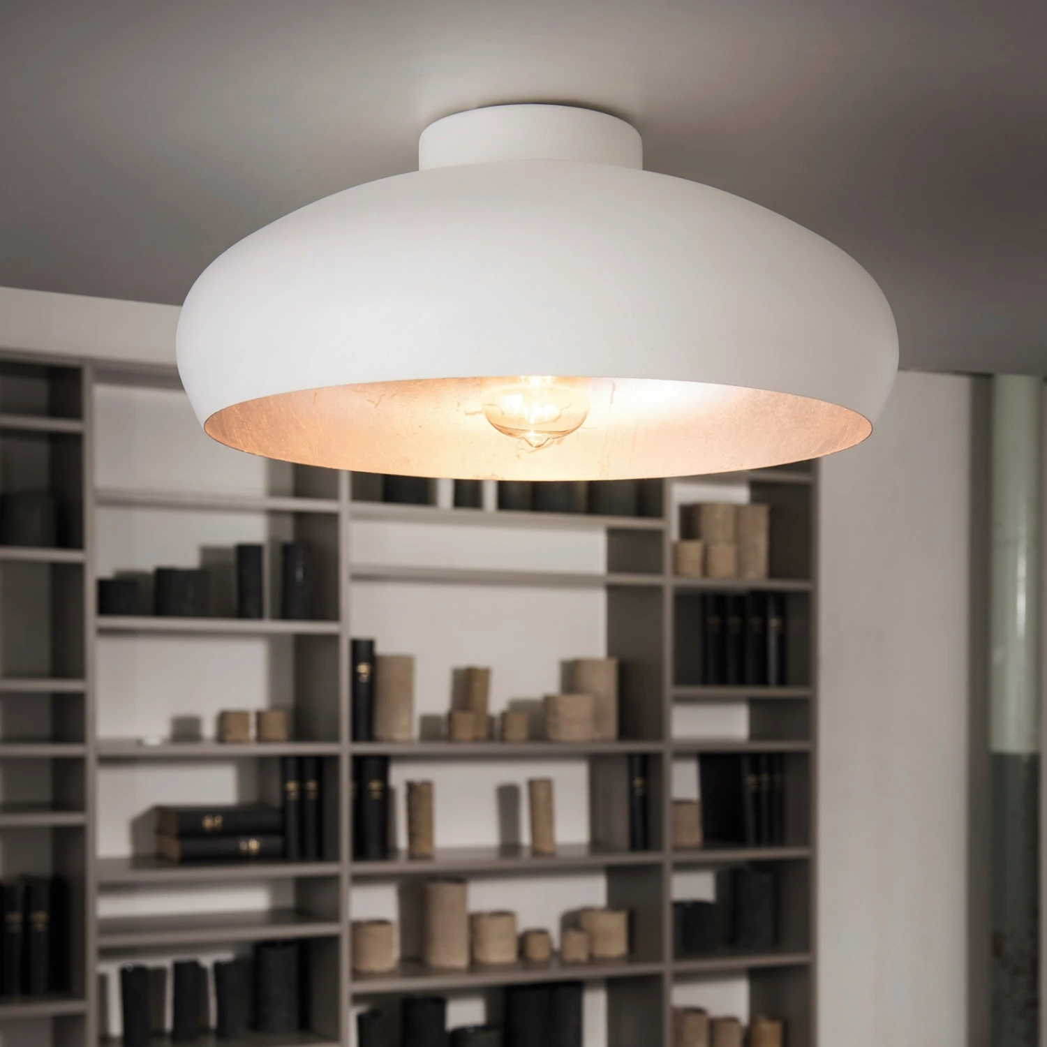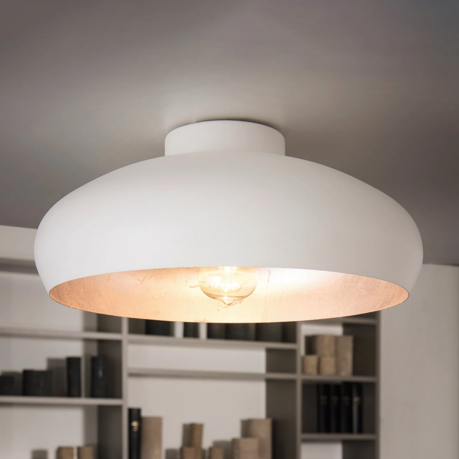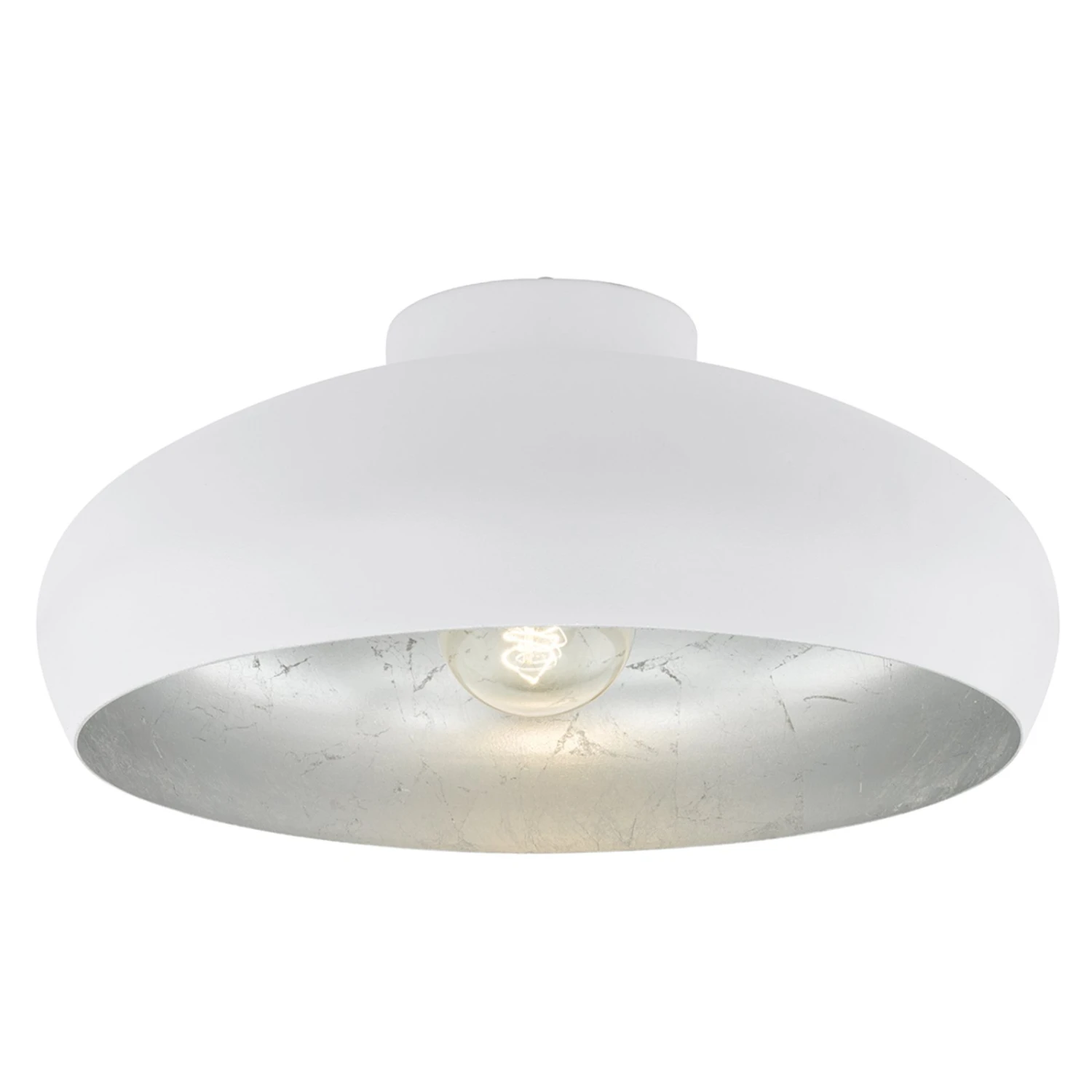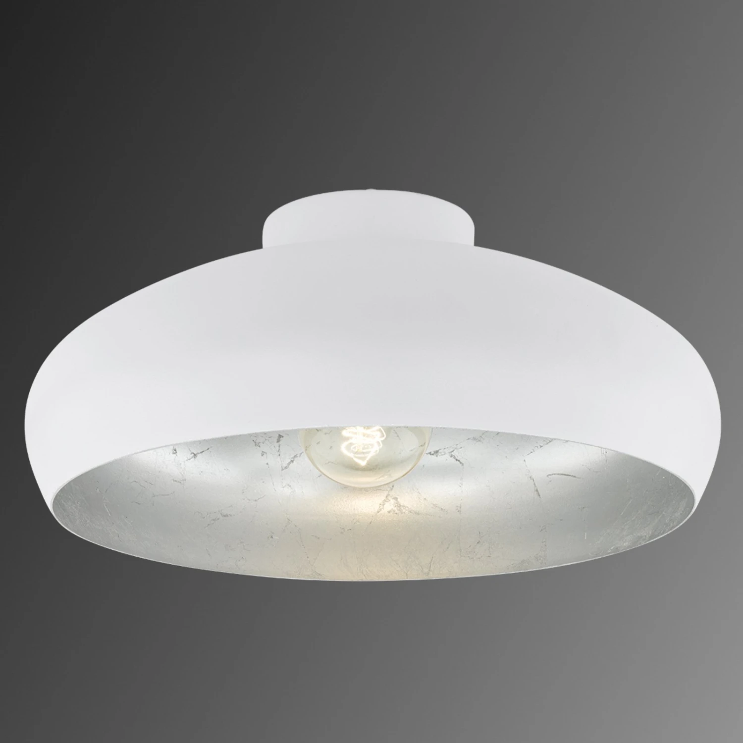 Plafonnier intemporel Mogano avec intérieur argentéAvec son abat-jour métallique en forme de demi-coque de 40 cm de diamètre, le plafonnier Mogano est idéal pour l’éclairage de base de nombreux locaux. Grâce à l’intérieur argenté de l’abat-jour normalement blanc, la lumière est diffusée de manière merveilleusement amplifiée dans l’environnement. Grâce à son design sobre et intemporel, le luminaire s’harmonise avec de nombreux styles d’aménagement et concepts de couleurs. La douille E27 peut accueillir tous les types d’ampoules jusqu’à 60 W maximum, ce qui permet d’utiliser également des ampoules LED à haute efficacité énergétique.