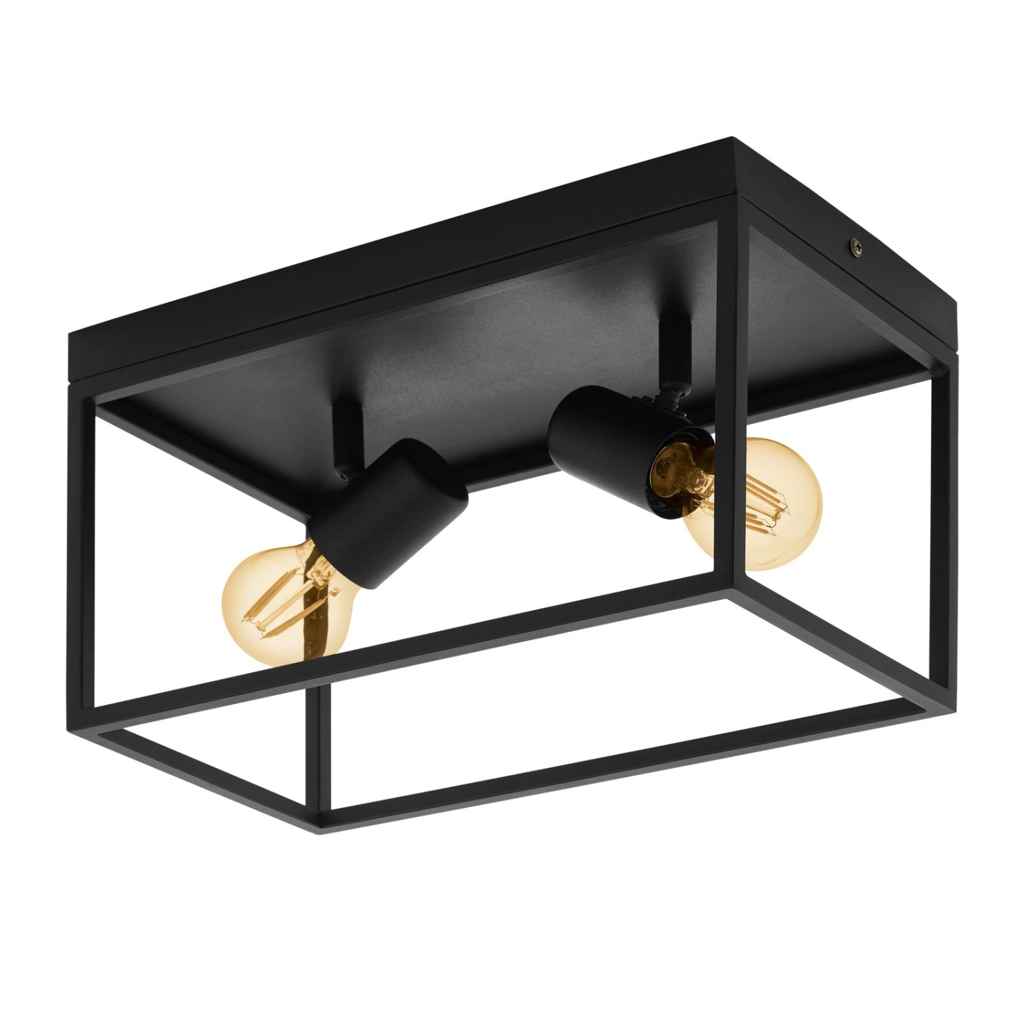 Le plafonnier Silentina présente un design géométrique moderne. Le boîtier ouvert en acier noir de forme cubique fournit un éclairage optimal grâce à deux prises. Grâce à la neutralité de sa couleur, la lampe à deux flammes s’intègre facilement dans différents styles d’ameublement.