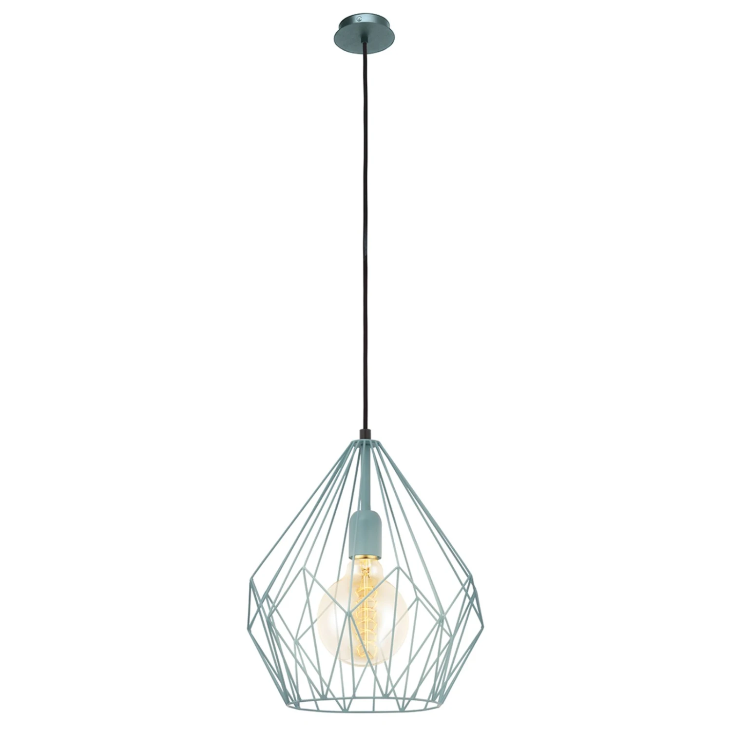 Des entretoises métalliques filigranes en forme de diamant forment l’abat-jour de cette pièce maîtresse de la suspension. La structure en fil métallique de couleur menthe qui entoure l’ampoule ne crée pas seulement une optique particulièrement colorée, mais aussi une image lumineuse unique qui résulte de la formation d’ombres des différentes entretoises métalliques lorsqu’elles sont allumées. Mais la suspension à câble, sur laquelle sont fixés le panier métallique et la douille E27, se démarque elle aussi merveilleusement du reste du luminaire, car elle est noire, contrairement à l’abat-jour.