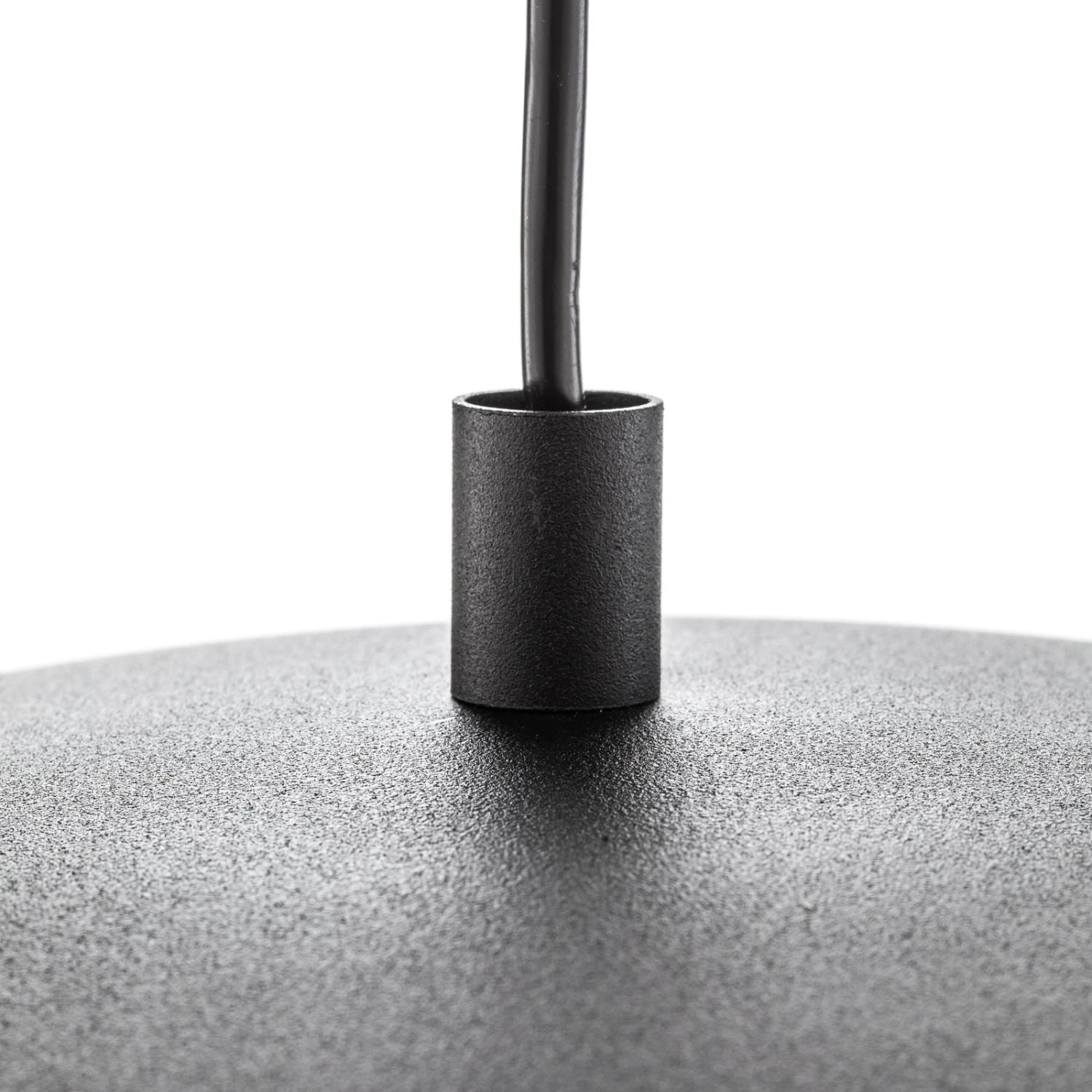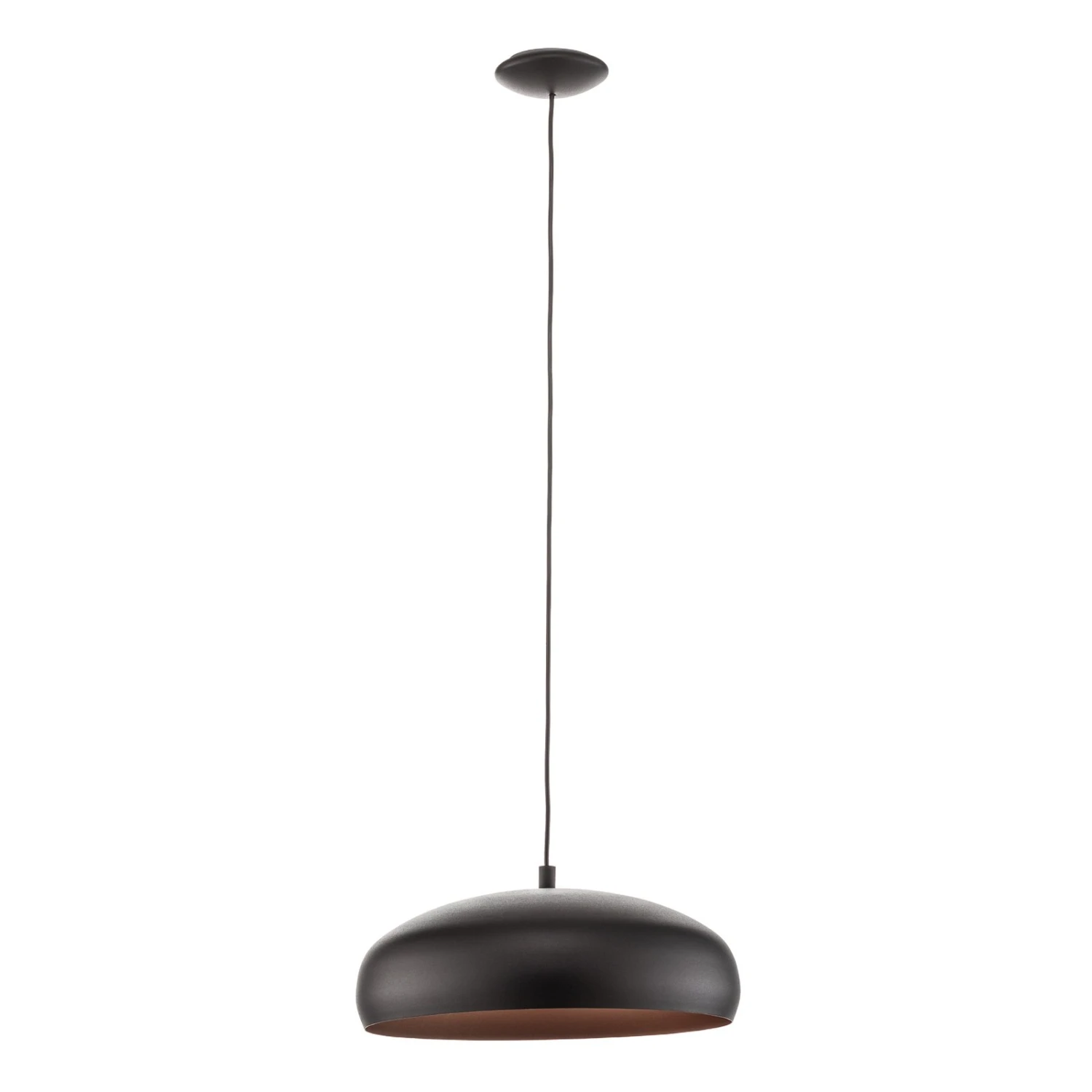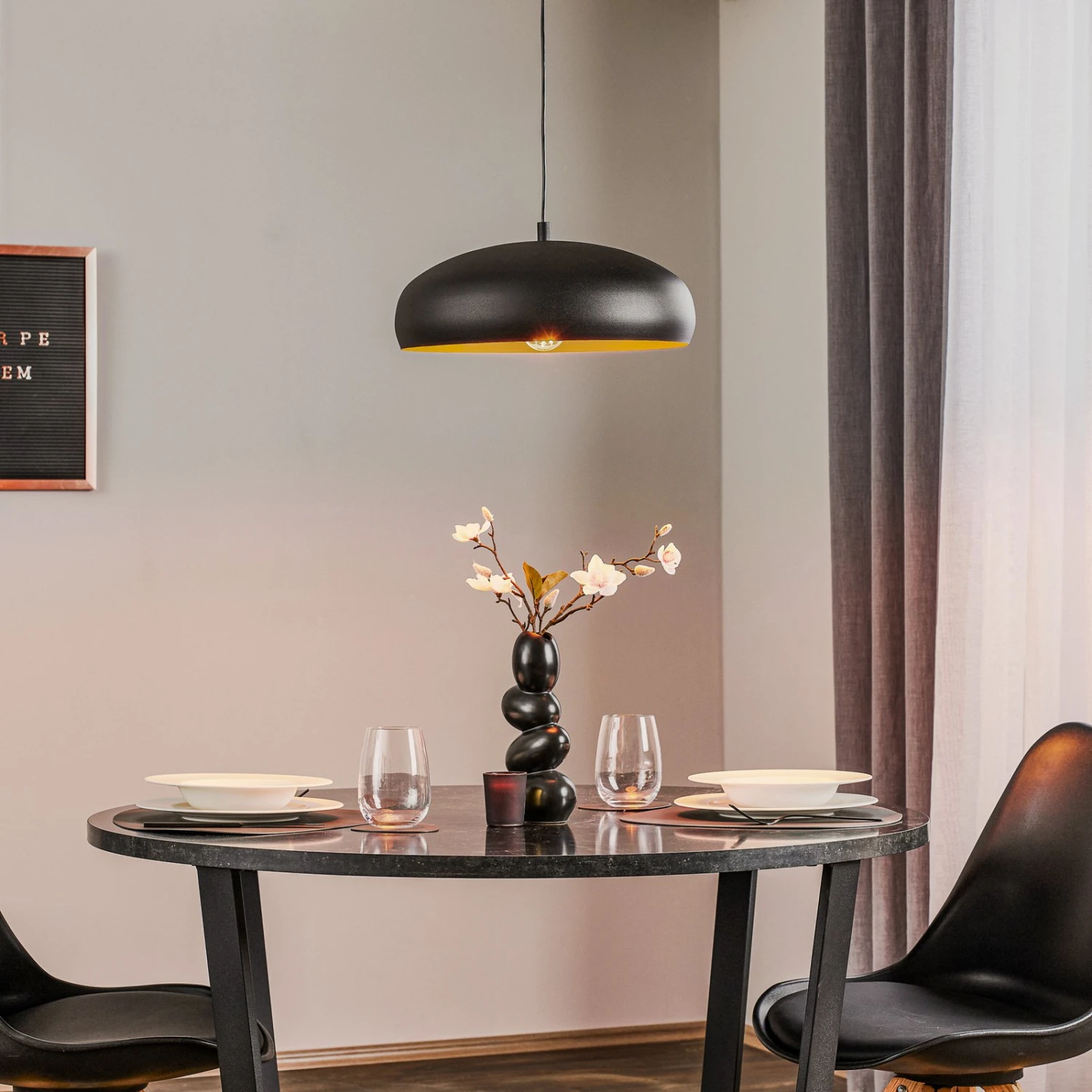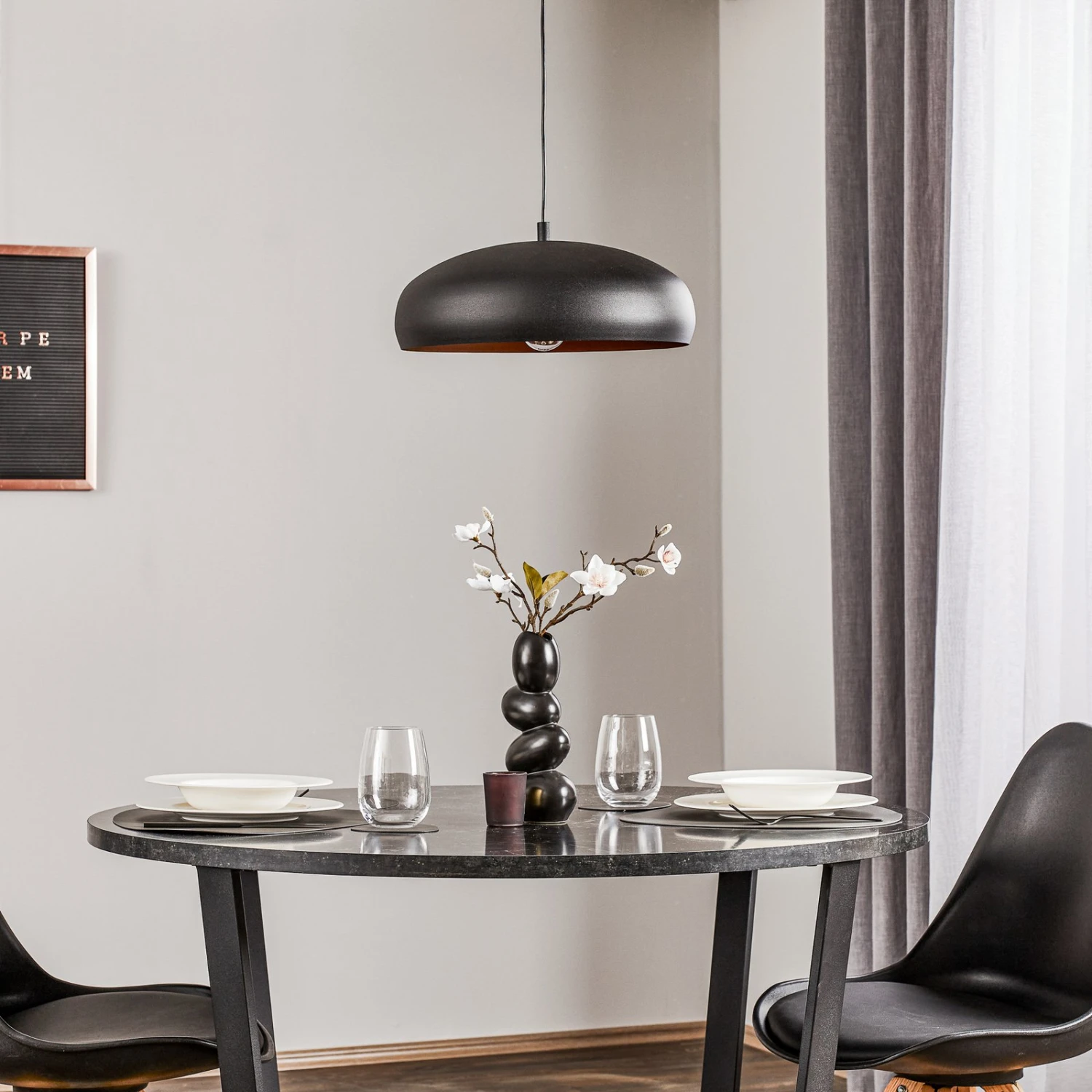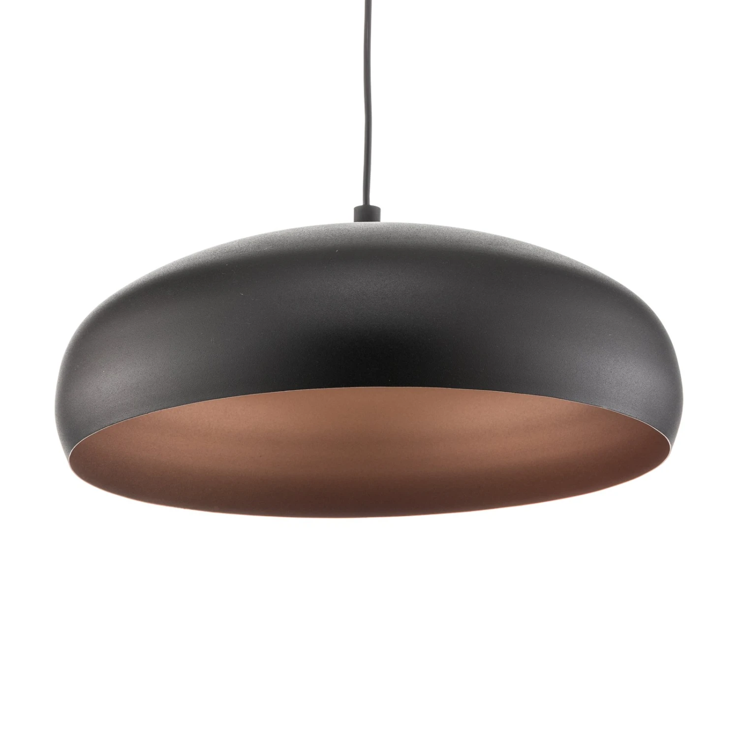La suspension Mogano dispose d’un solide abat-jour en métal, dont le diamètre de 40 cm est imposant. Il est suspendu à un câble noir qui relie la fixation ronde au plafond. Avec sa suspente longue de 110 cm, cette lampe convient idéalement à l’éclairage d’une table, que ce soit dans la salle à manger ou dans le salon. Parmi les éléments qui caractérisent cette suspension, il convient de mentionner son double coloris : noir à l’extérieur et couleur cuivre à l’intérieur.