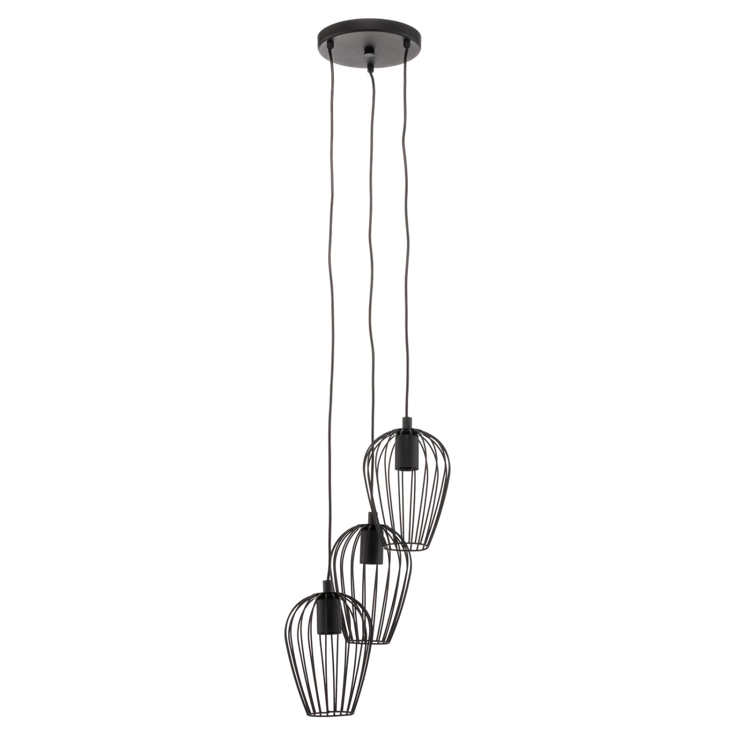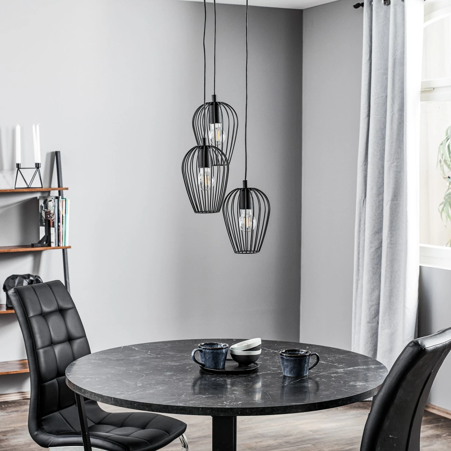 Une pincée de vintage s’installe dans le salon avec la lampe à suspension Newtown. La lampe noire est en acier et se compose d’un auvent rond auquel les trois abat-jour sont suspendus à des hauteurs différentes. Elles sont simplement constituées de montants métalliques individuels qui ont été formés en coupe de manière à ce que les illuminants soient complètement visibles. Il est donc recommandé d’utiliser des lampes à incandescence décoratives (non incluses).