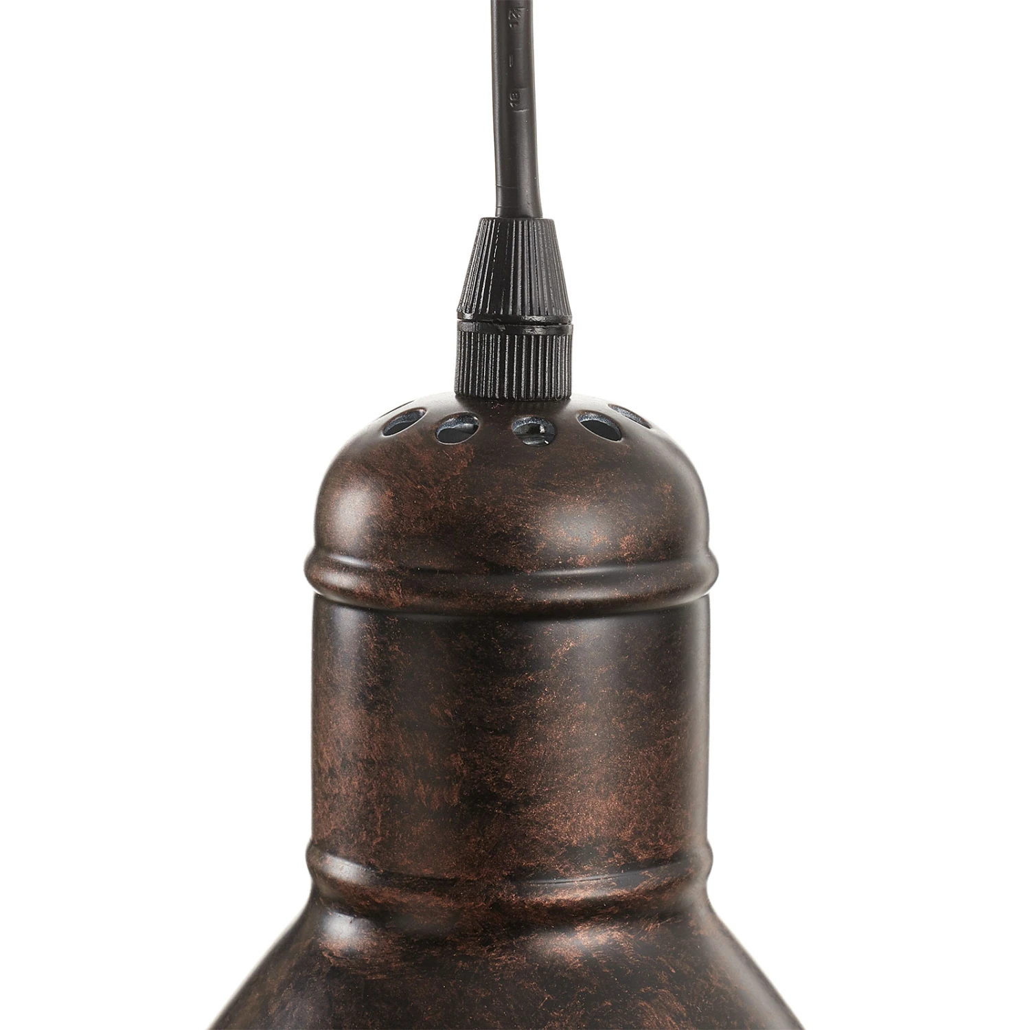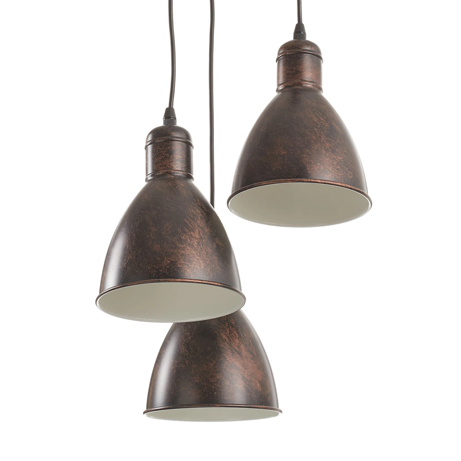 Trois abats-jours en métal de finition cuivre antique pendent du baldaquin rond – également en métal de couleur cuivre antique. La suspension Priddy 1 incarne le look vintage tendance et met en valeur n’importe quelle pièce meublée dans ce style. Selon les désirs, un éclairage économique en énergie peut être réalisé avec la suspension à trois flammes, car celle-ci peut être utilisée non seulement avec des ampoules à incandescence, mais également avec des ampoules LED ou encore des ampoules basse consommation (culot E27). Les parties intérieures blanches de l’abat-jour assurent une excellente réflexion de la lumière et ainsi également un éclairage lumineux.
