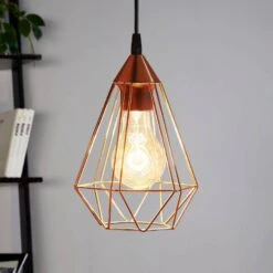 La lampe à suspension Tarbes à flamme unique au look vintage peut être utilisée pour éclairer une table d’appoint dans de nombreux styles de vie. En raison de la conception en cage ouverte de l’abat-jour constitué de montants métalliques de couleur cuivre, la lumière de la lampe utilisée (non incluse) peut rayonner sans entrave dans toutes les directions, seuls les montants se distinguent par les fines ombres portées dans l’environnement. Très décorative est une lampe avec une ampoule en verre clair et une optique à filament.