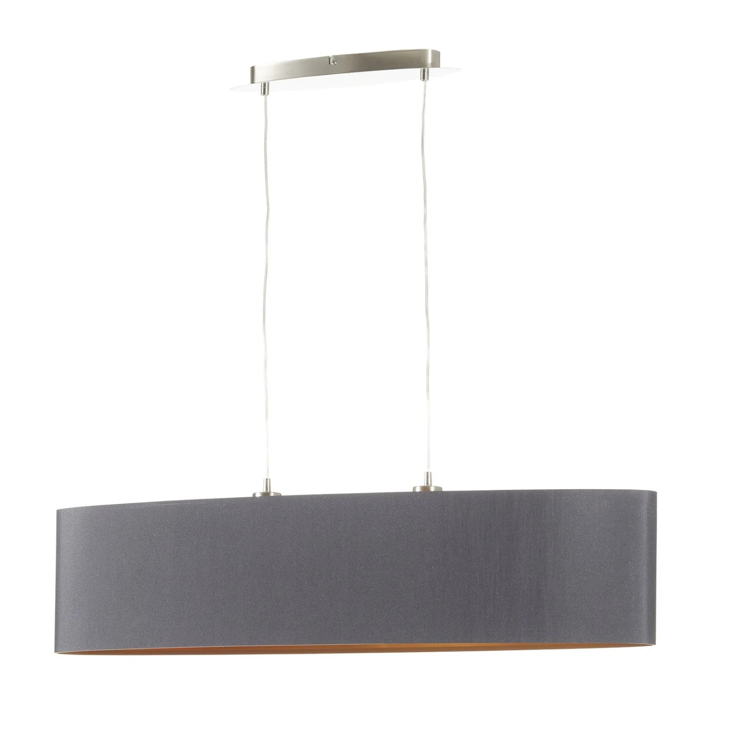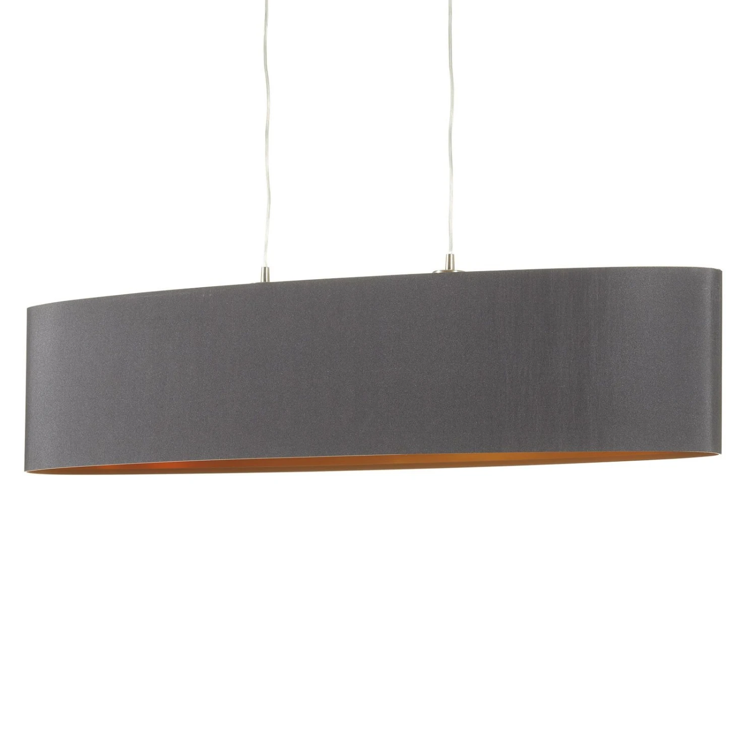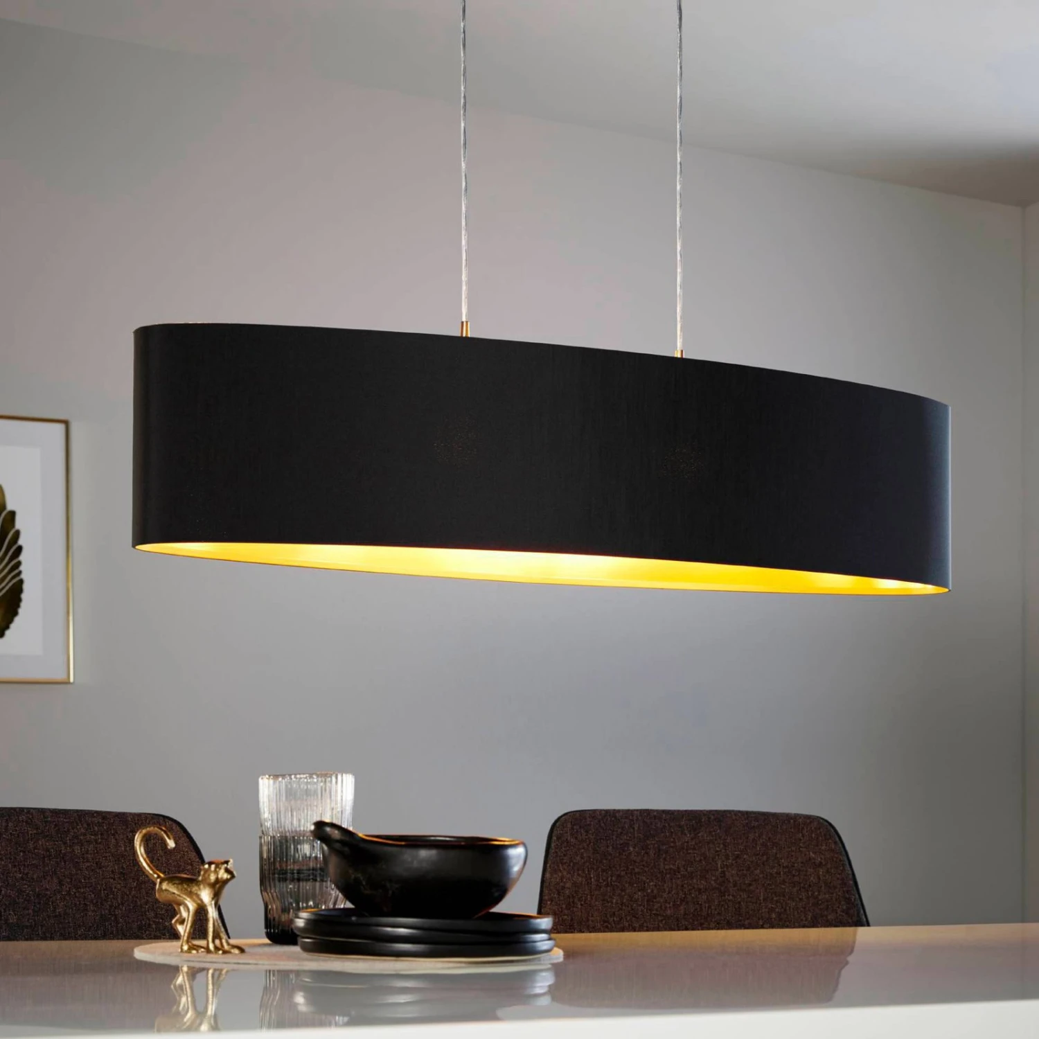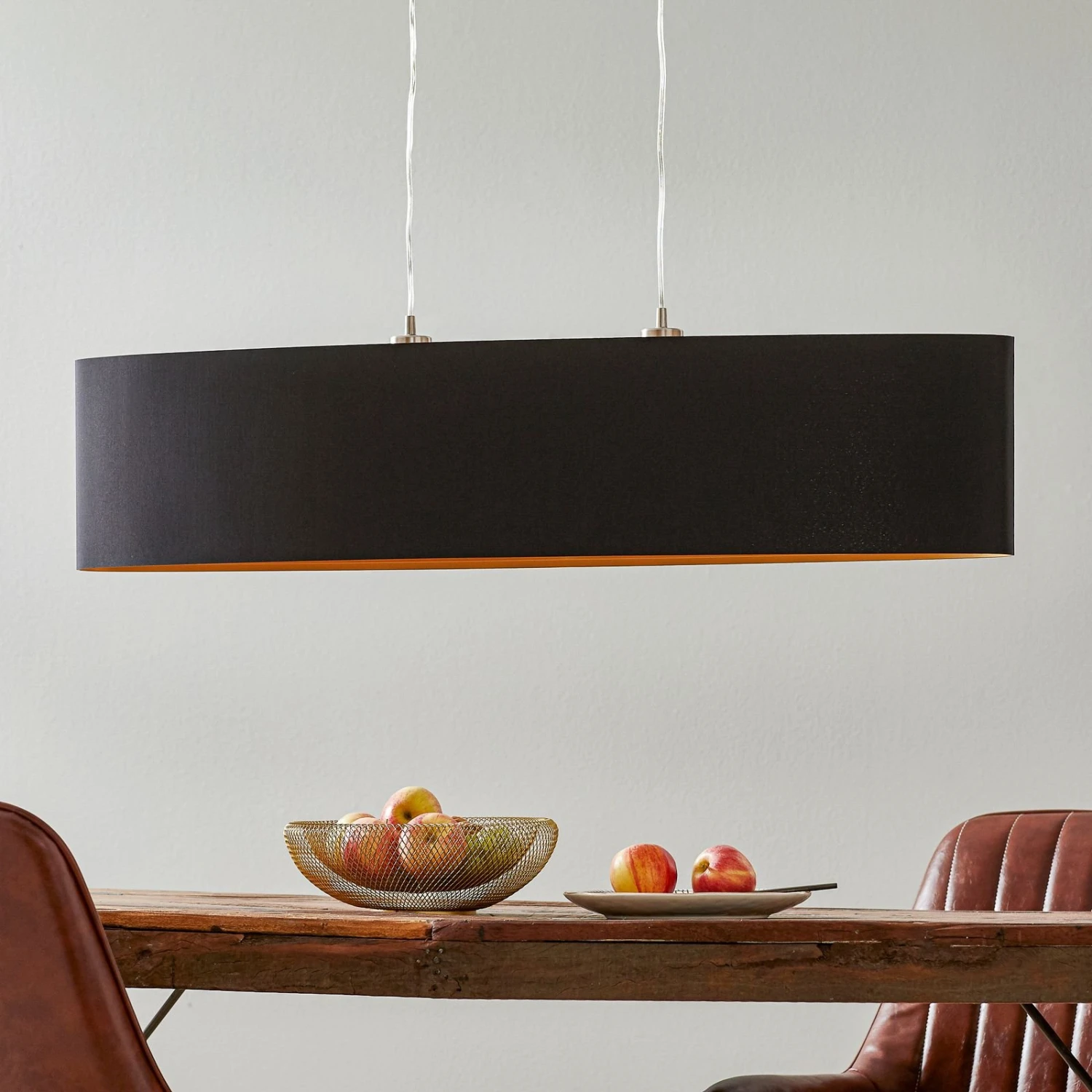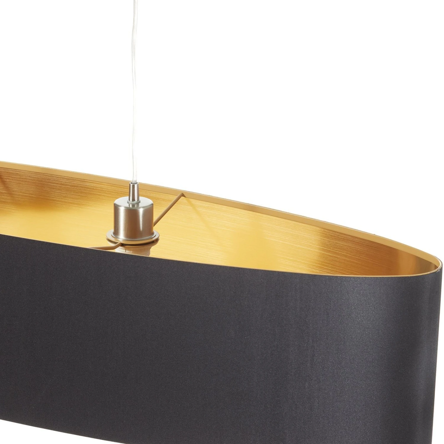 La suspension Lecio se montre comme un véritable attrape-regard dans toutes les pièces. L’abat-jour ovale est réalisé en noir à l’extérieur et de couleur doré à l’intérieur. En combinaison avec les deux ampoules, la pièce est mise en scène de manière charmante. La suspension est de 110 cm. Convient pour des LED ou des ampoules basse consommation avec des culots E27.